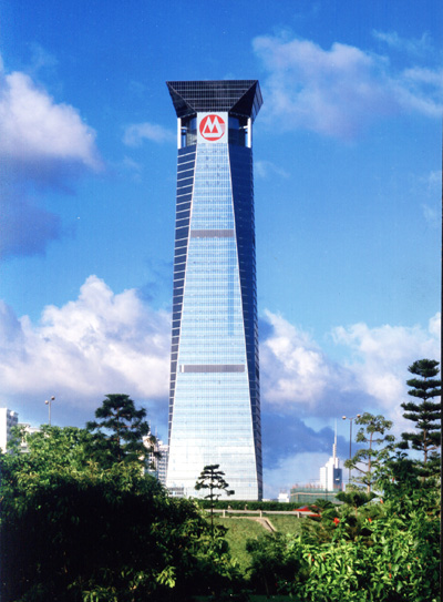深圳招商銀行大廈(原名深圳世貿中心大廈),位于深圳中心區西部深南大道旁,是深圳特區重要標志性建筑之一。該工程建筑面積119000平方米,地下3層,地上53層,建筑總高度237.2米;裙樓外墻為干掛花崗巖,裙樓以上外墻為單元式玻璃幕墻,屋面為直升飛機停機坪。主樓結構采用鋼骨混凝土框架—筒式結構,6層設鋼桁架轉換層,22層和38層設鋼桁架剛性層,鋼骨、鋼桁架桿件均采用50厚鋼板焊接方鋼管,整個工程鋼結構用量近萬噸。