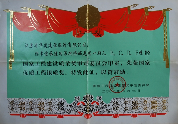 該工程先后榮獲2000年度深圳市雙優(yōu)文明工程稱號(A、B、C棟工程)、2001年度深圳市雙優(yōu)文明工程稱號(D、E棟工程);2003年度江蘇省揚州市“瓊花杯”及江蘇省省外“揚子杯”優(yōu)質工程獎(A、B、C棟工程)、2004年度江蘇省揚州市“瓊花杯”及江蘇省省外“揚子杯”優(yōu)質工程獎(D、E棟工程);2004年度國家優(yōu)質工程銀獎;QC小組課題“墻體清水混凝土質量控制”獲得江蘇省一等獎及全國工程建設優(yōu)秀QC小組獎。