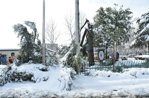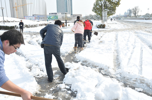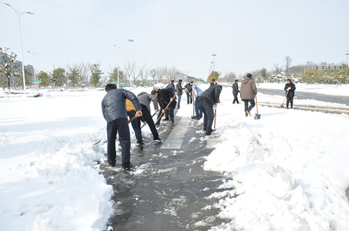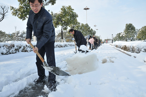 公司總部組織員工上路清掃積雪 時間:2013-02-19 4102 2月18日至19日凌晨,揚州出現低溫降雪災害天氣,降下了多年罕見的一場大雪,壓垮樹枝和部分房屋設施,并造成道路交通不便。19日清晨,公司響應市政府號召,組織20余名員工上路清掃積雪,公司領導吳士茂、錢啟明親自參加,與大家共同會戰2個多小時,完成了清掃任務。 厚重的積雪壓垮樹枝