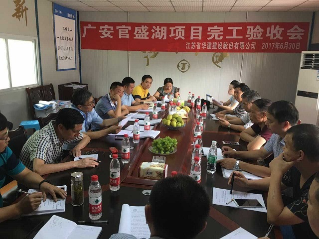 華建第一壩——官盛湖大壩工程順利通過完工驗收 時間:2017-07-03 3729 6月30日上午,華建首個水利項目——官盛湖大壩工程完工驗收會在項目會議室召開,廣安官盛新區管委會副主任蔣成文主持會議。經項目勘察、設計、監理、區住建局、質監站、水務局、發改局、財政局等單位和業主現場代表實測檢查、分別總結匯報后,一致同意工程驗收合格。 官盛湖大壩作為一項以城市景觀為主、兼有防洪功能的綜合性水利工程,主要由樞紐工程、泄洪渠工程組成。官盛湖湖區總庫容987.73萬立方米,壩頂長349米,最大壩高48.5米,壩體填筑總量達157.93萬方。