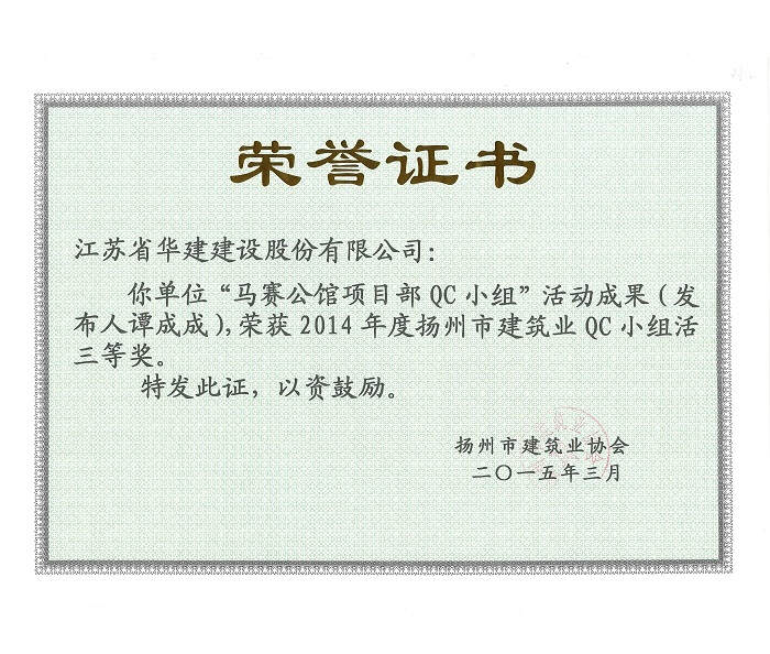 公司5項成果獲揚州市建筑業QC成果獎 時間:2015-03-31 4785 近日,揚州市建筑業協會發文表彰了2015年度全市建筑業QC小組活動成果獎,公司共有5項成果獲獎,其中,“孔令正QC小組”活動成果《剝蝕丘陵地貌多形截面鋼筋混凝土灌注樁施工新方法》榮獲一等獎,“佳程廣場5#樓項目QC小組”活動成果《提高核心筒筒體結構施工質量》、“重慶佳程廣場項目部QC小組”活動成果《提高現澆混凝土樓梯結構施工質量》、“丹田廣場二期項目部QC小組”活動成果《提高蒸壓加氣混凝土砌塊外墻合格率》榮獲二等獎,“馬賽公館項目部QC小組”活動成果《 提高耐磨金剛砂地面施工質量》榮獲三等獎。