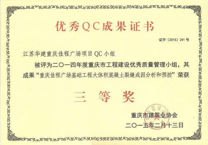 公司3項QC成果榮獲重慶市三等獎 時間:2015-04-02 4656 近日,重慶市建筑業協會發文表彰了一批優秀QC成果,公司重慶佳程廣場項目QC小組被評為2014年度重慶市工程建設優秀質量管理小組,其成果“提高箱型內設隔板式鋼柱內混凝土密實度”、“剝蝕丘陵地貌多形截面鋼筋混凝土灌注樁施工新方法”、“重慶佳程廣場基礎工程大體積混凝土裂縫成因分析和預控”等均榮獲三等獎。