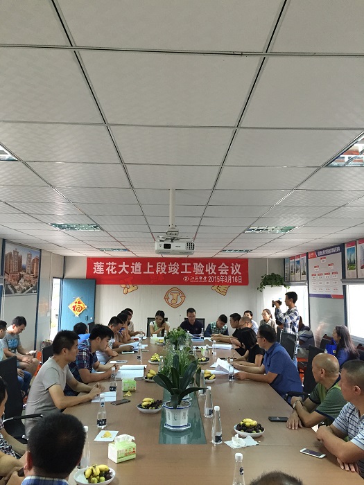 官盛新區管委會規建處主任柏魯代表驗收小組發言,宣讀了驗收小組驗收結論,原則同意驗收意見。他總結指出,蓮花大道上段竣工驗收代表了官盛新區建設取得了又一項重要成果,希望各參建單位再接再厲、再創佳績。李榮盛常委做總結發言,他表示蓮花大道上段的竣工驗收實屬不易,對該工程竣工驗收表示熱烈祝賀,同時充分肯定了江蘇華建前階段工作,對現場工程質量、安全生產、文明施工管理、施工進度給予了高度評價。