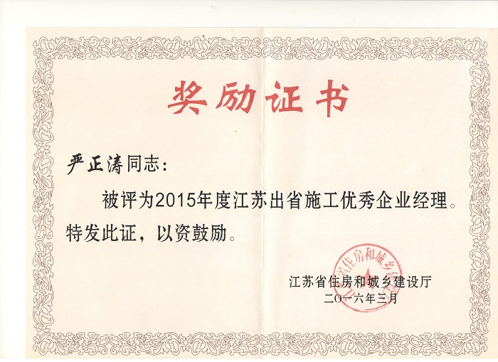 重慶分公司被表彰為“2015年度江蘇出省施工先進企業” 時間:2016-04-20 2958 近日,重慶分公司被江蘇省住房和城鄉建設廳表彰為“2015年度江蘇出省施工先進企業”,重慶分公司總經理嚴正濤榮獲“2015年度江蘇出省施工優秀企業經理”稱號,樊晨亮被評為“2015年度出省施工優秀黨務工作者”。