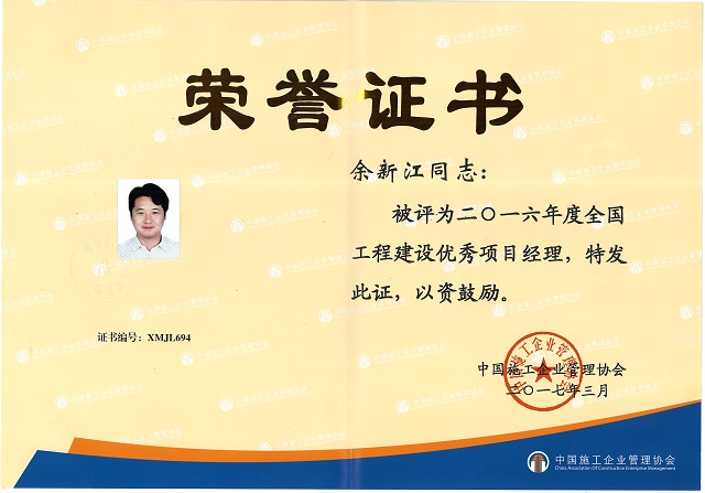 余新江榮獲“2016年度全國工程建設(shè)優(yōu)秀項目經(jīng)理” 時間:2017-04-24 3296 4月20日 ,中國施工企業(yè)管理協(xié)會第32次年會在廈門召開。會上,中施企協(xié)對全國優(yōu)秀項目經(jīng)理進行了表彰,珠海分公司余新江同志被授予“2016年度全國工程建設(shè)優(yōu)秀項目經(jīng)理”稱號。