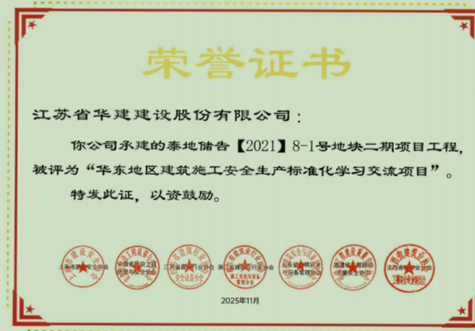 近日,江蘇華建揚州分公司承建的泰地儲告〔2021〕8-1號地塊二期項目榮獲“華東地區建筑施...