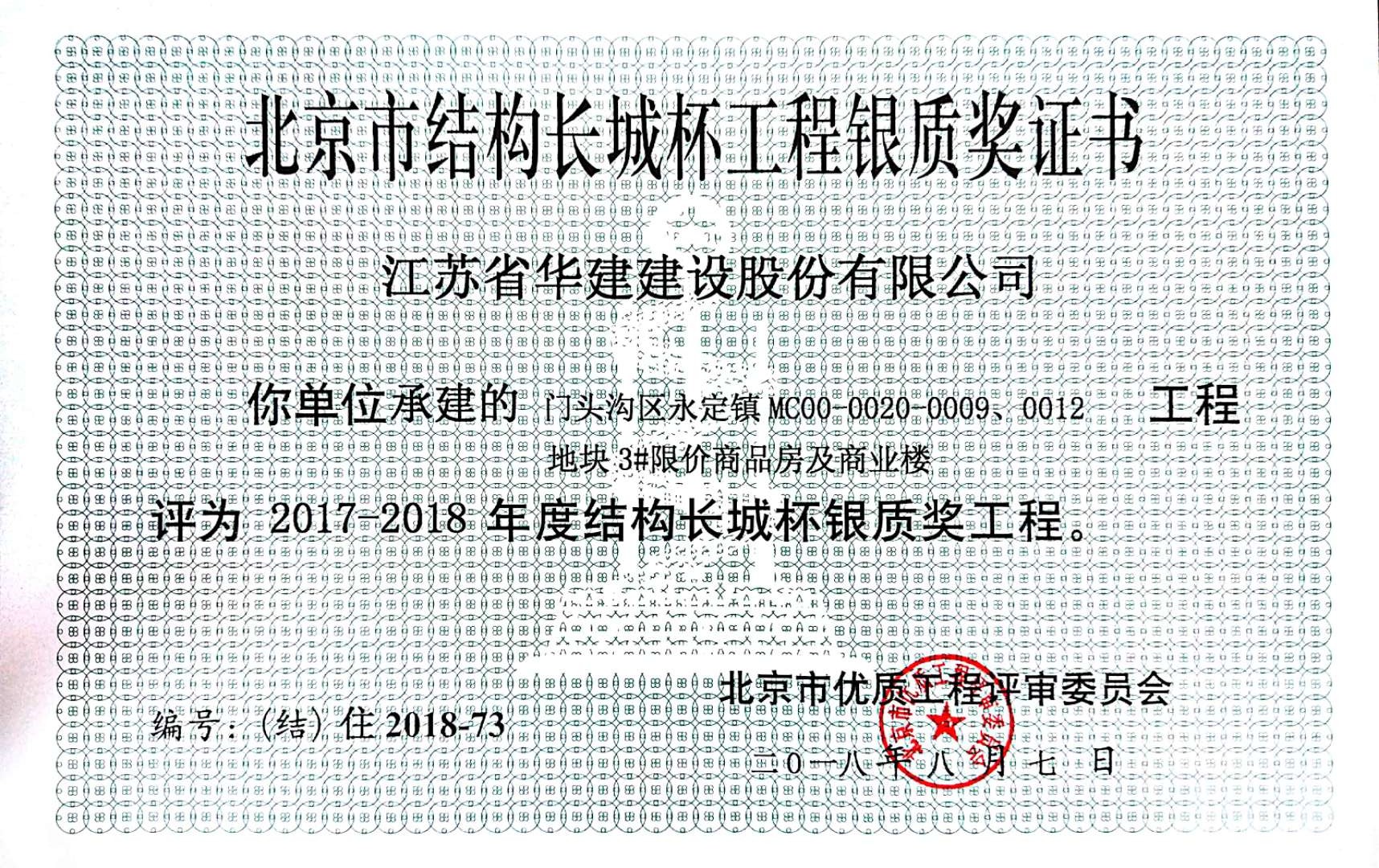 北京公司再獲兩項省級優質結構工程 時間:2018-10-20 3259 近日,北京市工程建設質量管理協會公布了2017-2018年度北京市結構長城杯工程及獲獎單位,由北京公司承建的門頭溝區永定鎮MC00-0020-0009、0012地塊3#限價商品房及商業樓項目獲得結構長城杯銀質獎。 同時,由我司承建的綠城楊柳郡一期17#樓、18#樓、裙房及地下室工程被評定為2018年廣西建設優質結構獎。