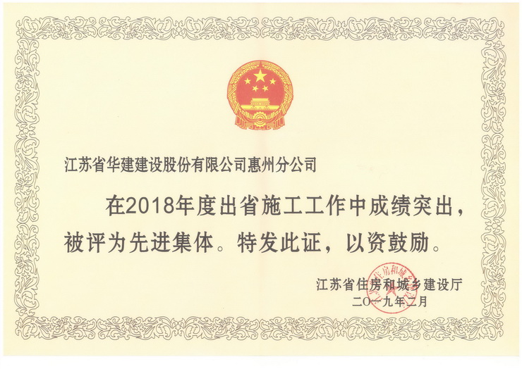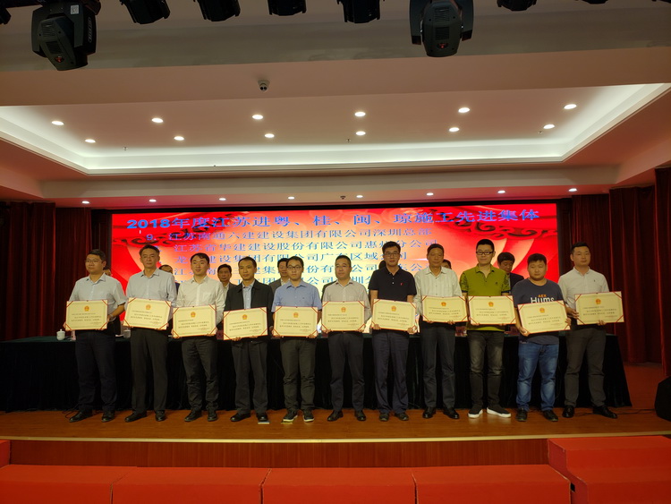 會議表彰了一批江蘇出省施工先進集體及先進個人。其中,惠州公司被江蘇省住房和城鄉建設廳表彰為2018年度江蘇出省施工先進集體,總經理周群利、技術質量處主任陳申高被江蘇省住房和城鄉建設廳表彰為2018年度江蘇出省施工先進個人;黃秀剛、邵群斌、王興東分別被江蘇省人民政府駐深圳(廣州)辦事處表彰為2018年度江蘇進粵、桂、閩、瓊施工質量安全、經營財務和新聞報道先進個人。