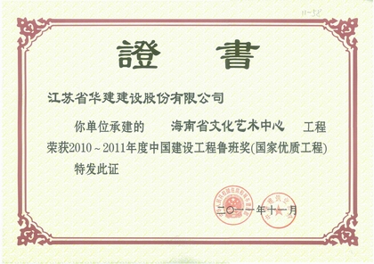 海南省文化藝術(shù)中心(海南省歌舞劇院)是海南省委、省政府在“十一五規(guī)劃” 期間實施的重點惠民公共文化設(shè)施,是海南文藝繁榮發(fā)展的新座標。坐落于海南文化公園中軸線上,工程建筑面積23500平方米,東西長128米,南北寬113米,高33米,包括可同時容納1300人的劇場、演出輔助用房、排練房等建筑,建筑造型酷似一只展翅飛翔的大鳥。工程總造價1.94億元。先后獲得2009年度國家AAA級安全文明標準化誠信工地、全國優(yōu)秀質(zhì)量管理小組稱號及全國質(zhì)量信得過班組稱號等多項榮譽。通過技術(shù)創(chuàng)新,獲得省級工法兩項、省級QC成果兩項、省級優(yōu)秀技術(shù)論文三篇,被評為海南省新技術(shù)應(yīng)用示范工程。2011年11月,榮獲2010-2011年度中國建設(shè)工程魯班獎(國家優(yōu)質(zhì)工程),是公司獲得的第16個“魯班獎”項目。